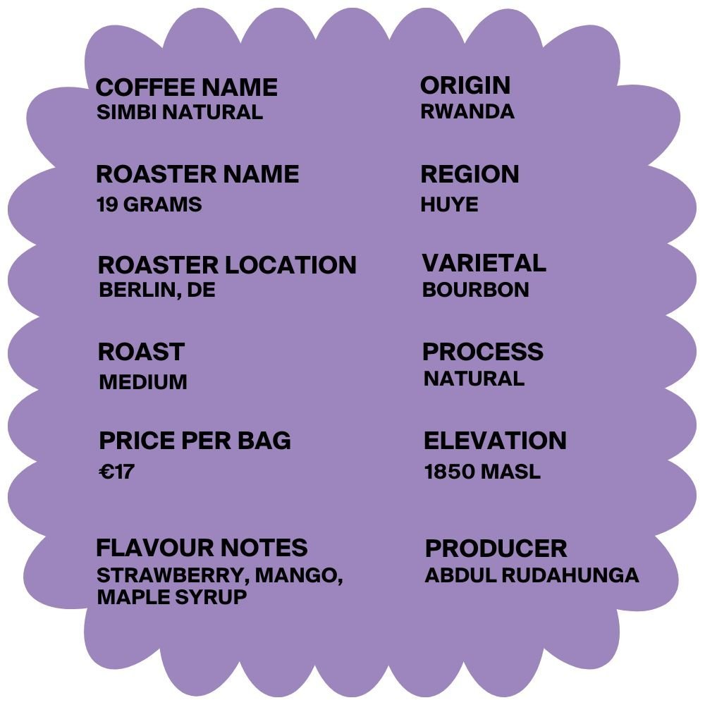 The Simbi Natural coffee from 19 Grams Coffee Roasters comes from the Huye region in Rwanda, Africa.