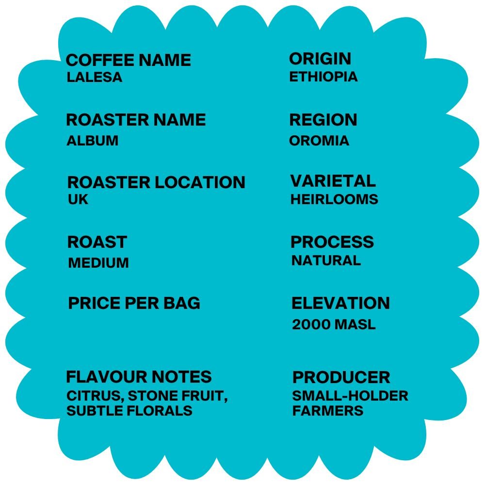 The Lalesa coffee from Album coffee roasters originates from the Oromia region of Ethiopia.