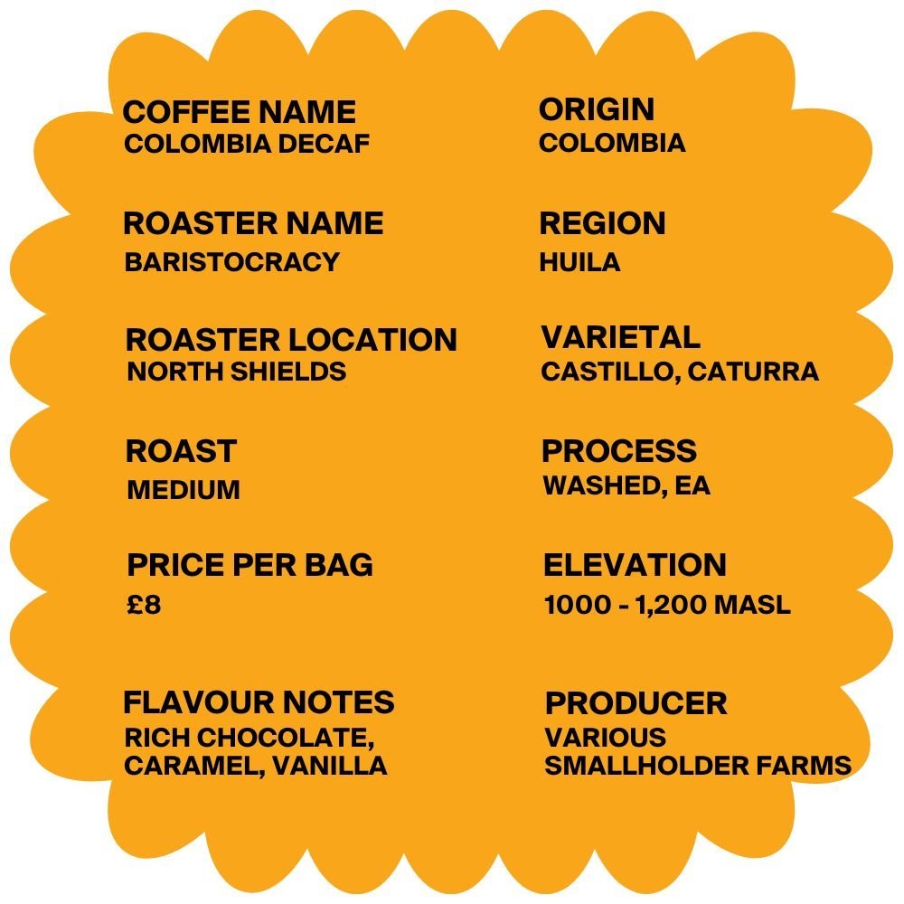 Here’s an idea of what to expect from this Colombian decaf coffee from Baristocracy Coffee Roasters.