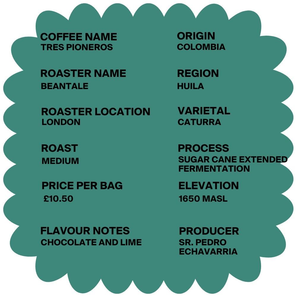 The Tres Pioneros coffee from Beantale Coffee Roasters originates from the Huila region of Colombia.