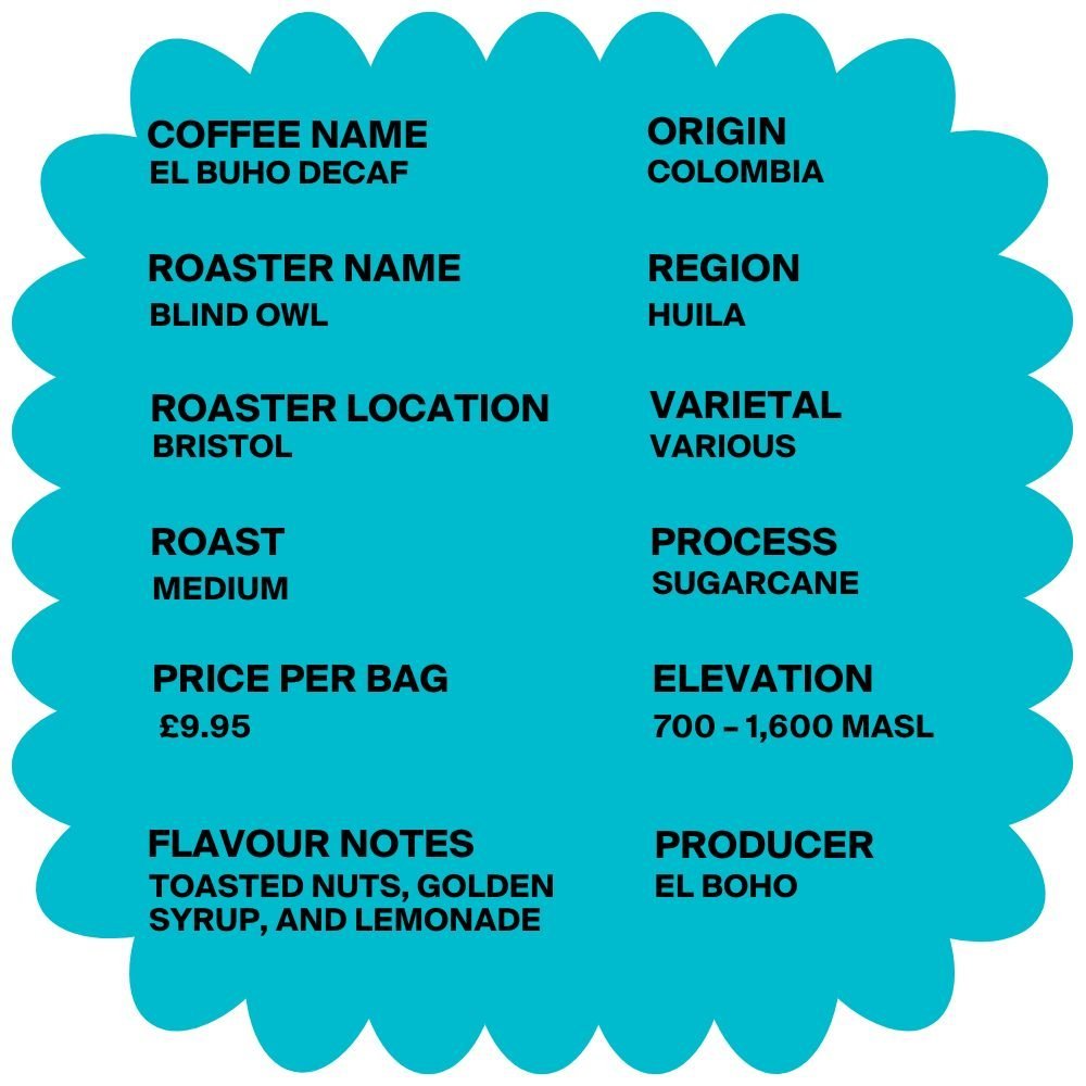 El Buho is a washed sugarcane decaf coffee sourced from farmers in the Huila and Tolima regions of Colombia. It seems almost fate that this delicious decaf is called El Buho – which translates to “The Owl”! Blind Owl have always prided theirselves on sourcing decaf that is all compromise on caffeine, but doesn’t compromise on flavour!