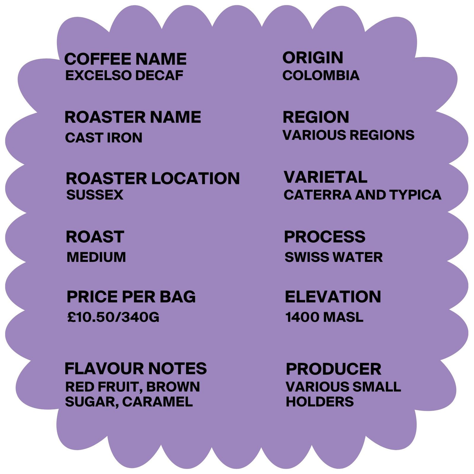 The Excelso Decaf coffee from Cast Iron Coffee Roasters originates from Colombia.