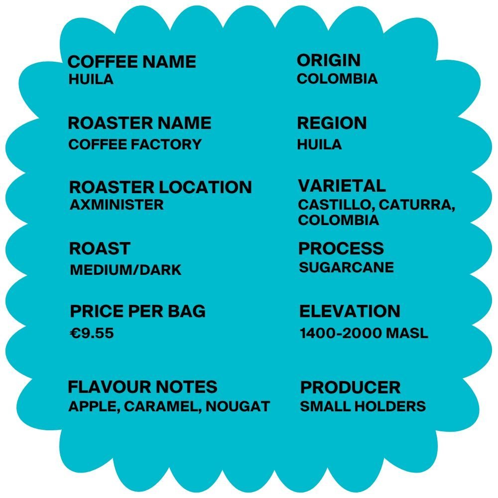 The Huila decaf coffee from The Coffee Factory originates from Huila region Colombia.