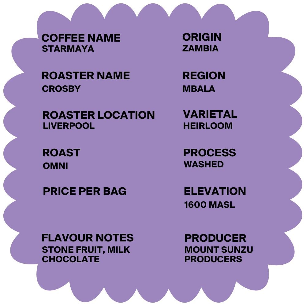 The Starmaya AA coffee from Crosby Coffee originates from the Mbala region of Zambia.