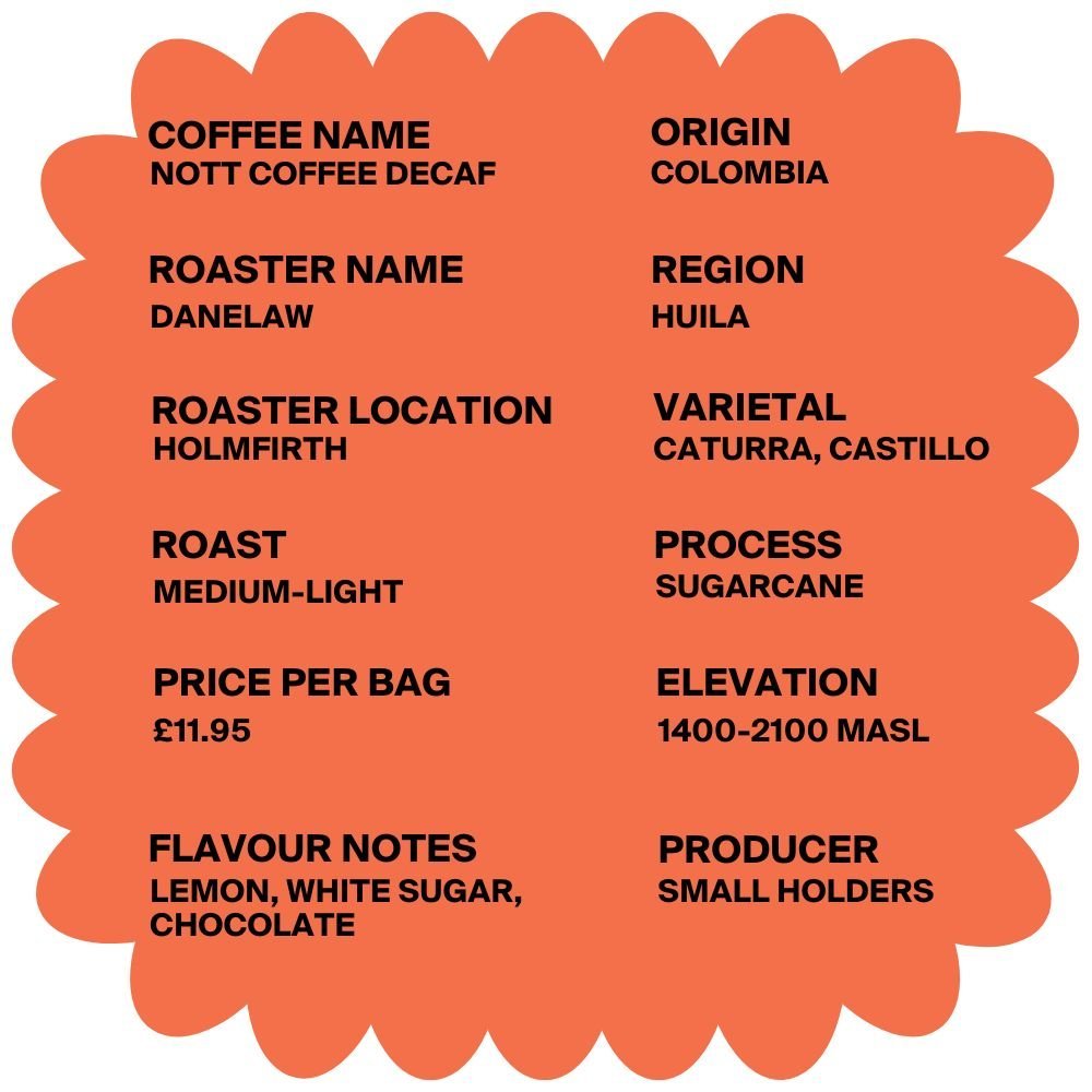 The Nott coffee decaf from Danelaw originates from the Huila region of Colombia.