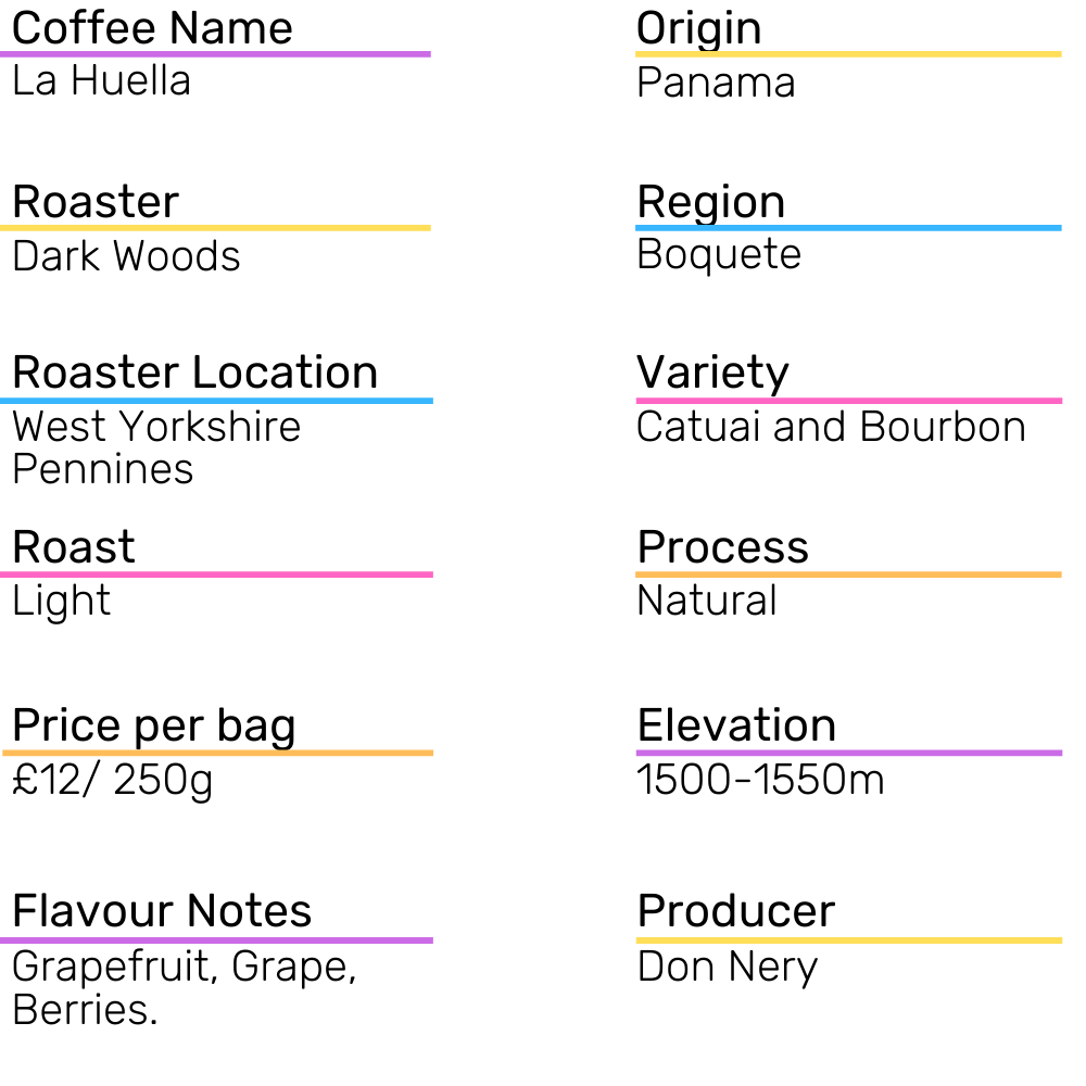 Opening its doors in 2013, the three founding partners came together with a wealth of experience in the industry. Their collective knowledge and expertise allowed them to rapidly establish themselves amongst others in the space and quickly grow a loyal customer base. Their unique location is reflected in their eye-catching branding which jumps off the shelf. The range of coffees and care that is taken with each roast is testament to the expertise behind Dark Woods. The La Huella From Dark woods was a coffee I couldn’t wait to try. Having spent a few months in Panama I do have a little bit of a soft spot for Panamanian coffee. Not only because of a personal connection, but the coffees from this area of the world do tend to be well produced and sometimes can knock your socks off. A coffee-growing country that has the infrastructure and economy of a coffee consuming county, it is no wonder Panama produces some of the best coffee in the world when you see how advanced coffee farming is here. La Huella did Panama justice. The coffee begins by rushing straight over your palette to the back of your mouth and reminded me of the sensation that you get when eating a fresh grapefruit, which is quite unusual for a natural. It is enjoyably acidic but layered with enough sweetness to remove the sharpness that is sometimes present with overly acidic coffees. As the coffee cools the sweetness becomes more pronounced but the grapefruit acidity lingers in the aftertaste. As the coffee cools close to room temperature, it takes another twist and loses the grapefruit acidity in place of grapes and sweeter tasting berries. The body remains throughout the brew which had a fairly cloudy appearance, Its bright vibrant flavours a pleasant surprise. The coffee is a wonderful example of how complex Panamanian coffee can be. Its complexities are a testament to the care that has been taken from the fincas of Boquete in Panama to the Dark Woods roastery in the West Yorkshire Pennines. A coffee to be enjoyed and savoured right to the last drop. Brewed best as a pour over. Give it a couple of days to express itself.