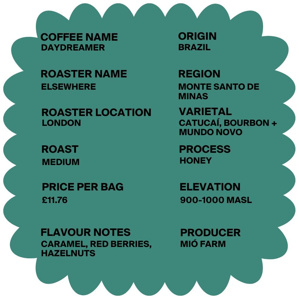 The Daydreamer coffee from Elsewhere coffee roasters originates from the Minas Gerais Region of Brazil.
