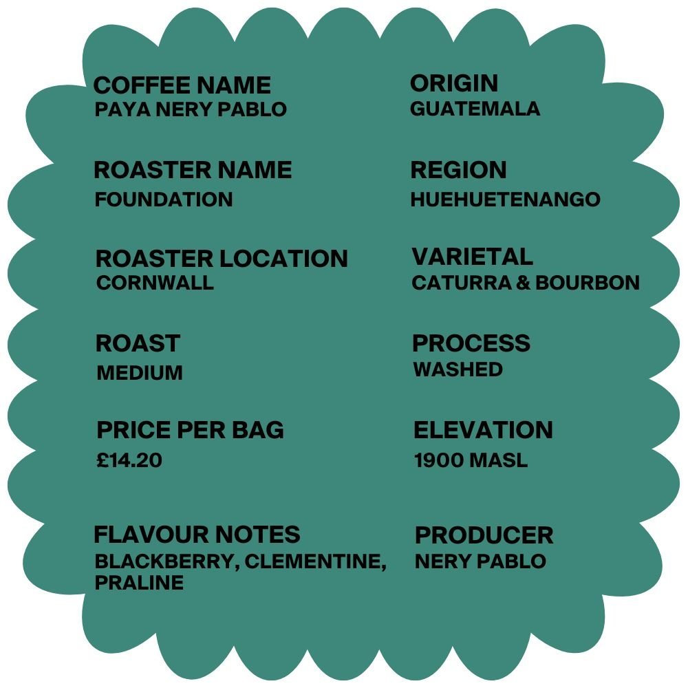 The Paya Nery Pablo Coffee from Foundation Coffee Roasters originates from the Huehuetenango region of Guatemala.