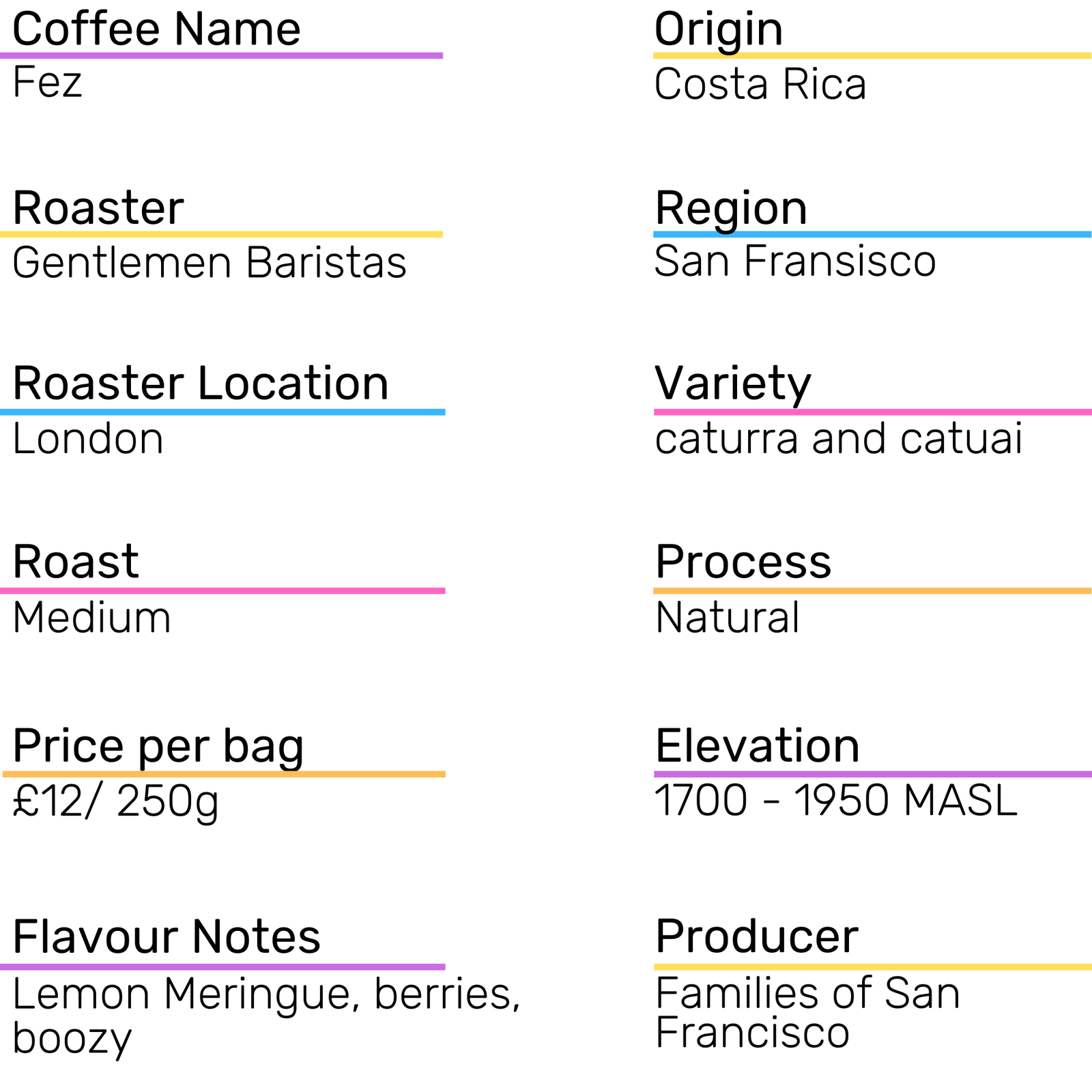 Costa Rican coffee is one of my favourites. Having not having a great deal of experience with it during my time in Australia it wasn’t until I actually visited Costa Rica that I realised why the country was at the forefront of speciality coffee. The abundance of water and perfect coffee growing land alongside a fairly stable economy and a large number of micro mills mean that not only is Costa Rican coffee super traceable it is also well produced. The Fez from Gentlemen Baristas originates from the San Francisco community which is located in San Francisco de León Cortes. The community has grown from 12 producer families in 2014, to 40 producers in 2017. Each of these 40 producer families contributed to this lot of community coffee in the 2016/2017 harvest. The families cultivate caturra and catuai varieties at altitudes ranging between 1700 to 1950 MASL in the privileged district of Llano Bonito. The production capacity of the community has grown to 250 bags.