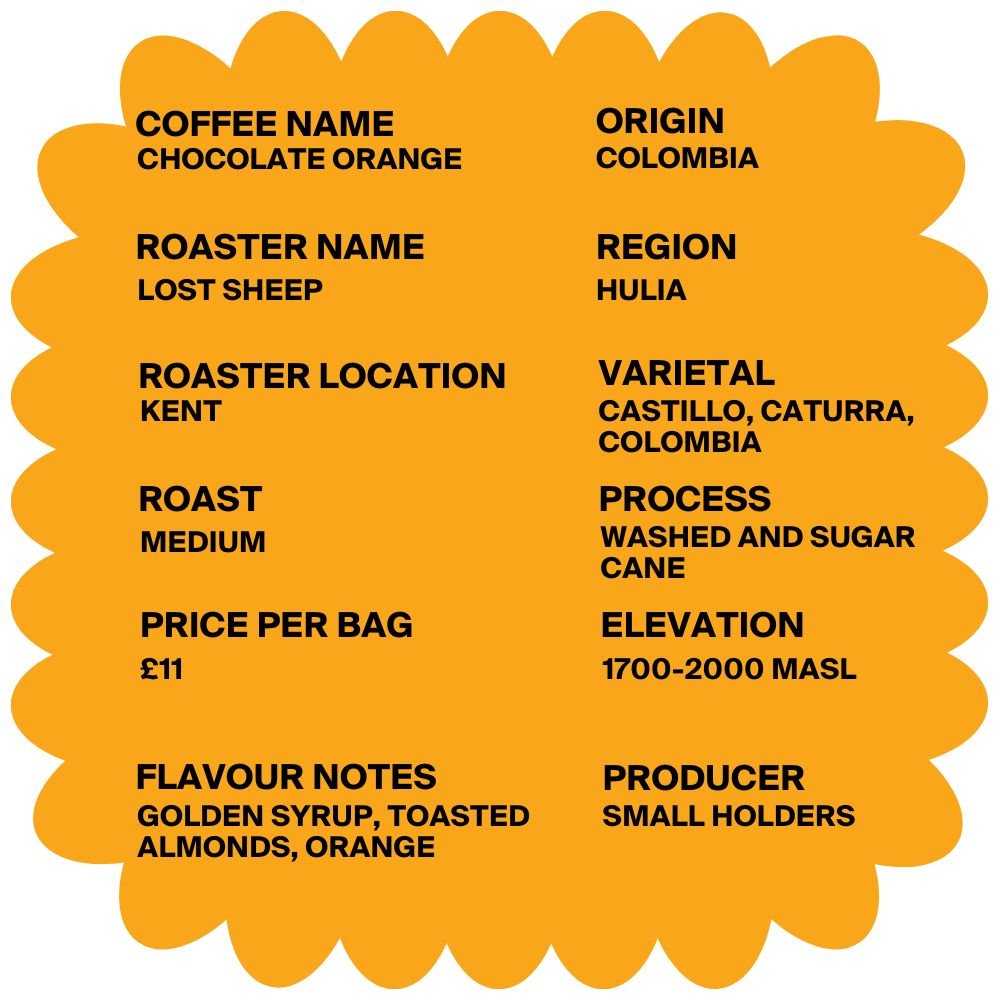 The Chocolate Orange Decaf coffee from Lost Sheep Coffee Roasters originates from the Huila region of Colombia.