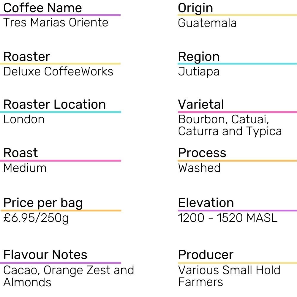 The Tres Marias Oriente coffee from Deluxe Coffee Works originates from the Jutiapa region of Guatemala.