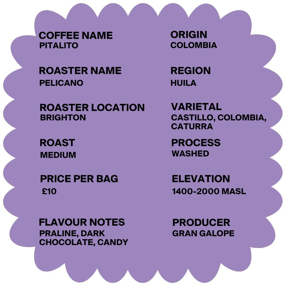 The Pitalito coffee from Pelicano Coffee Roasters originates from the Huila region of Colombia.