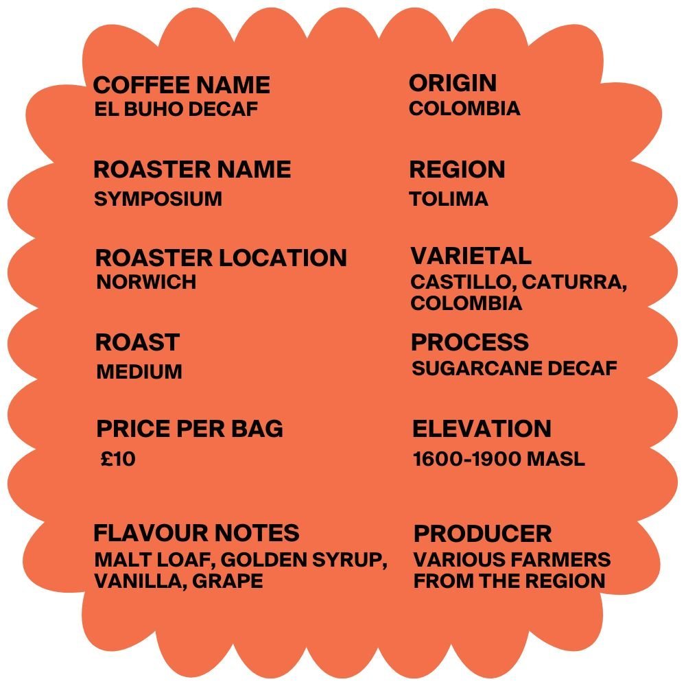 The El Buho decaf coffee from Symposium coffee roasters originates from the Tolima region of Colombia.