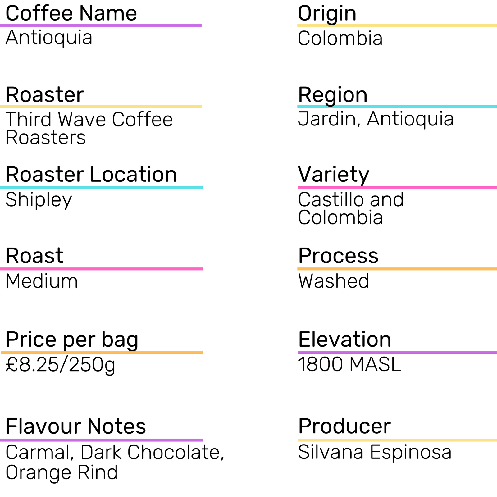 The Colombian Coffee from Antioquia originated from Finca La Mesa which is sat just outside of the picturesque town of Jardin in the village of La Linda. The small 2.5 Hectare farm belongs to Silvana Espinosa who acquired the farm 5 years ago.