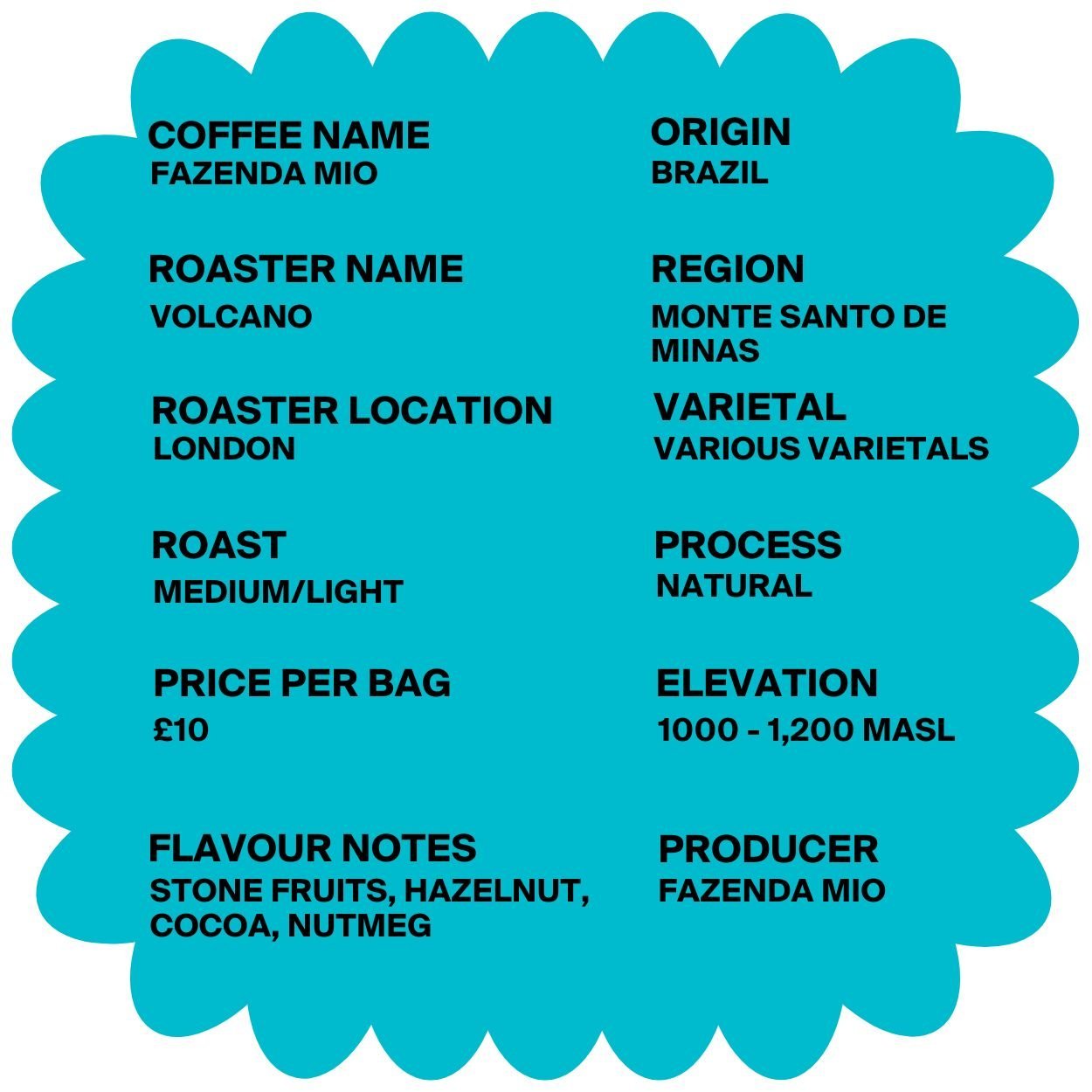 The Fazenda Mio coffee from Volcano originates from the Monte Santo de Minas region of Brazil.