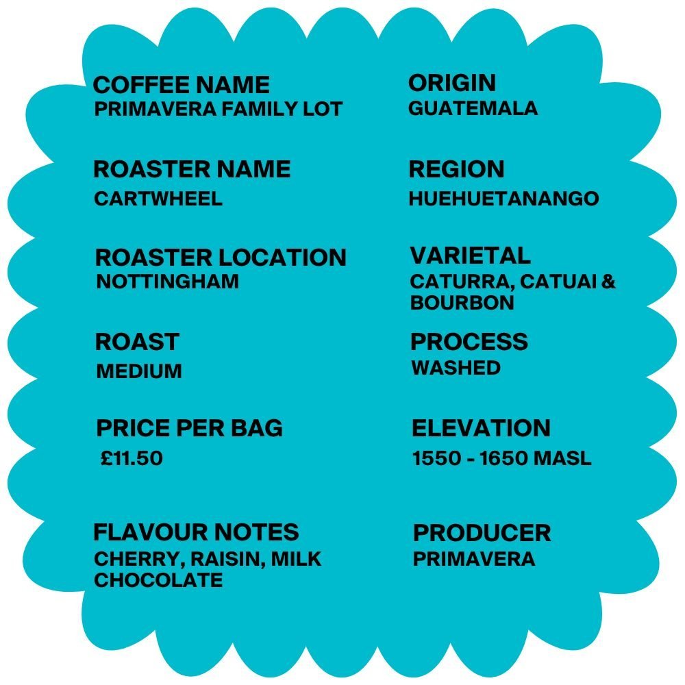 The Primavera Family lot coffee from Cartwheel Coffee Roasters originates from the Huehuetenango region of Guatemala.