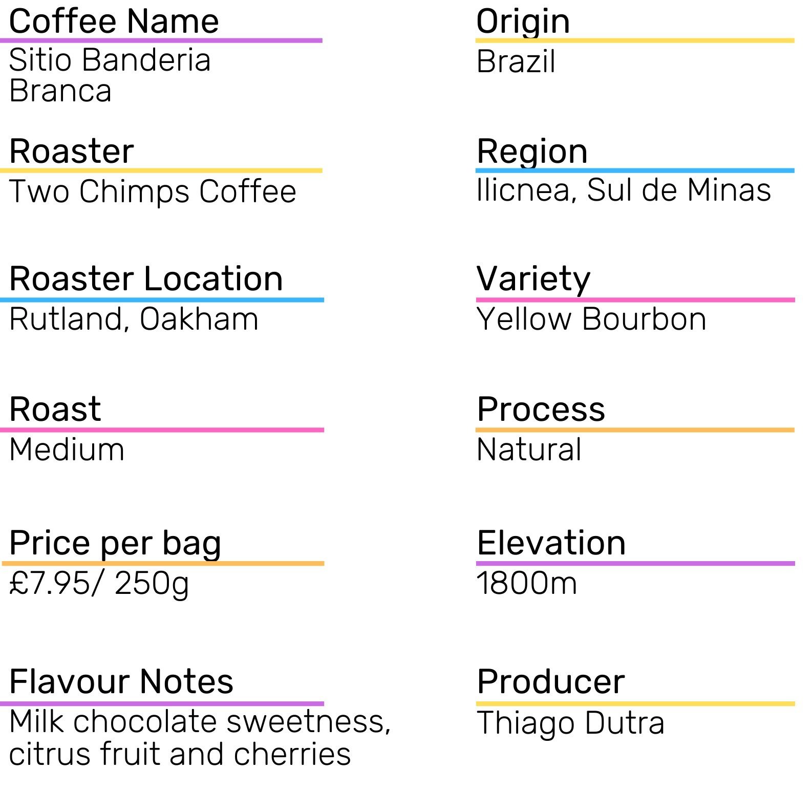 The Sitio Banderia Branca coffee from Two Chimps is a medium roasted Brazilian natural. The name is also the farm that the coffee was grown which is located in the Ilicnea region of the country. It is a yellow bourbon and grown and produced at 1800m.